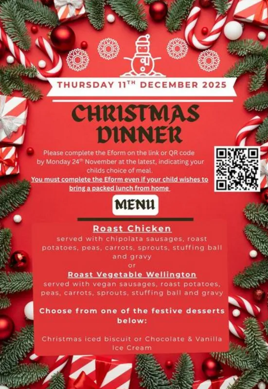 Please complete the E-form on the link below by Monday 24th November at the latest, indicating your child's meal choice. (You must complete the E-form even if your child is not having a Christmas dinner.)